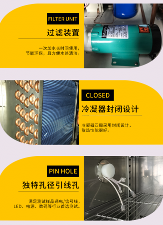 制冷系統把壓力較低的蒸汽壓縮成壓力較高的蒸汽,使之壓力升高后送入冷凝器,在冷凝器中冷凝成壓力較高的液體,經節流閥節流后,成為壓力較低的液體后,在蒸發器中吸熱蒸發而成為壓力較低的蒸汽,再送入壓縮機的入口,從而完成制冷,通過安裝在箱體內的旋轉風扇,使箱體實現氣體循環、平衡箱體內的溫、濕度,由箱體內置的溫、濕度傳感器采集的數據,傳至溫濕度控制器(PLC彩色觸摸屏)進行編輯處理,下達調溫調濕制冷指令,通過空氣加熱單元、冷凝管以及水槽內加熱蒸發單元的共同完成。